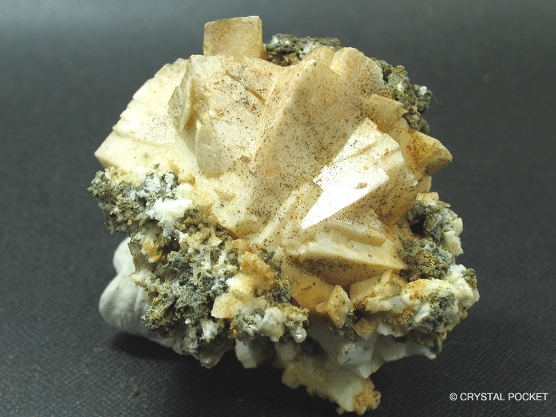 石英と氷長石からなる脈の晶洞からのもの、緑泥石を伴う。国産として甲武信鉱山産は、かなりの逸品。双晶となっており結晶の連なりが、扇状に広がっている。
