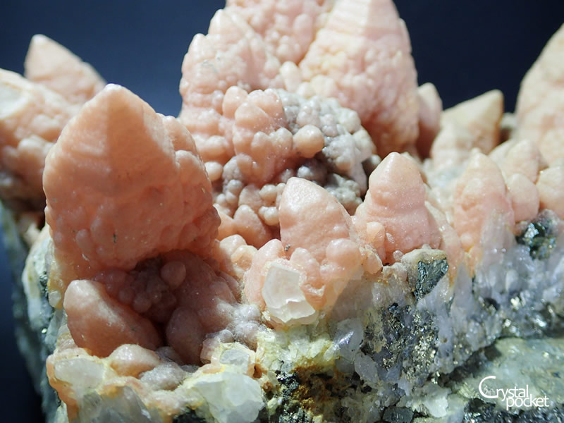大型水晶の群晶の上を覆った淡いピンクの菱マンガン鉱です。