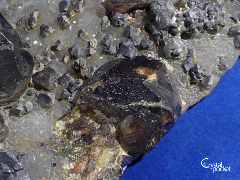 細かい水晶の上に小さな立方体の方鉛鉱を伴い、5センチにもおよぶべっこう亜鉛の結晶が晶出しています。