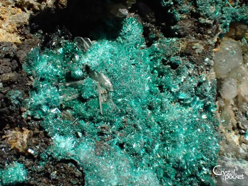 黄銅鉱や黄鉄鉱を含む石英の晶洞に晶出した孔雀石の標本です。緑の色合いが大変美しい標本です。